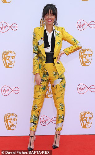 اتسمت إطلالة الممثلة البريطانية بالغرابة والتشويش، فاختارت بدلة توسكيدو صفراء بطبعة على شكل طيور اللقلق والمناظر الاستوائية.