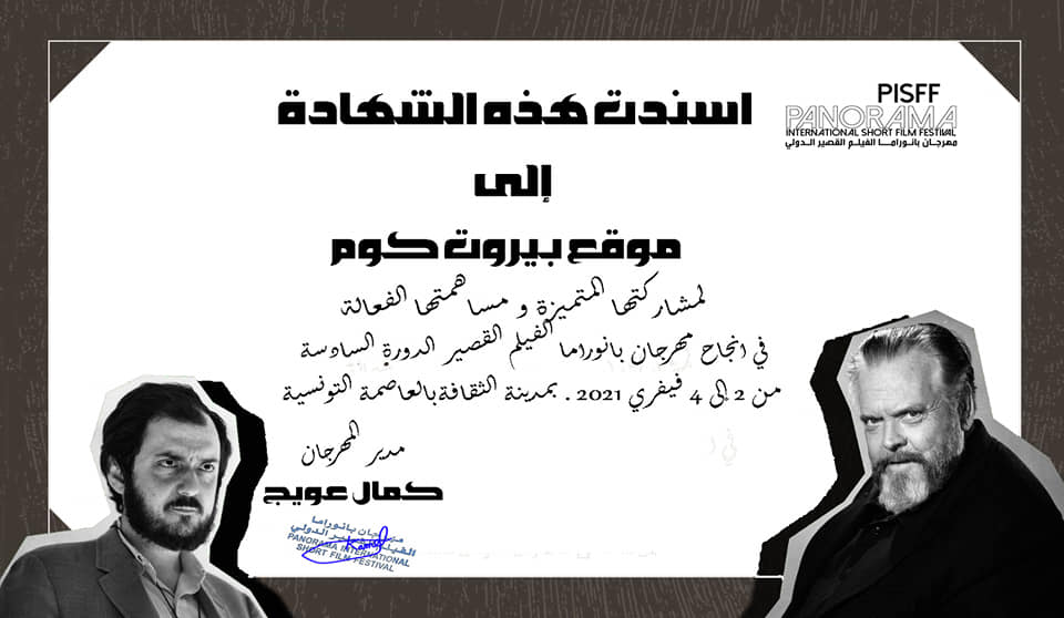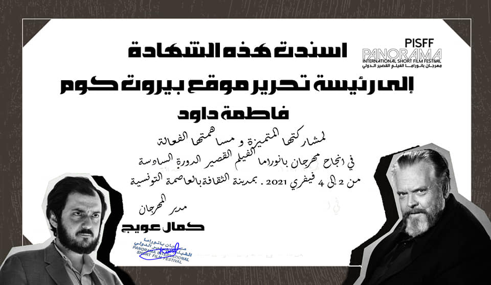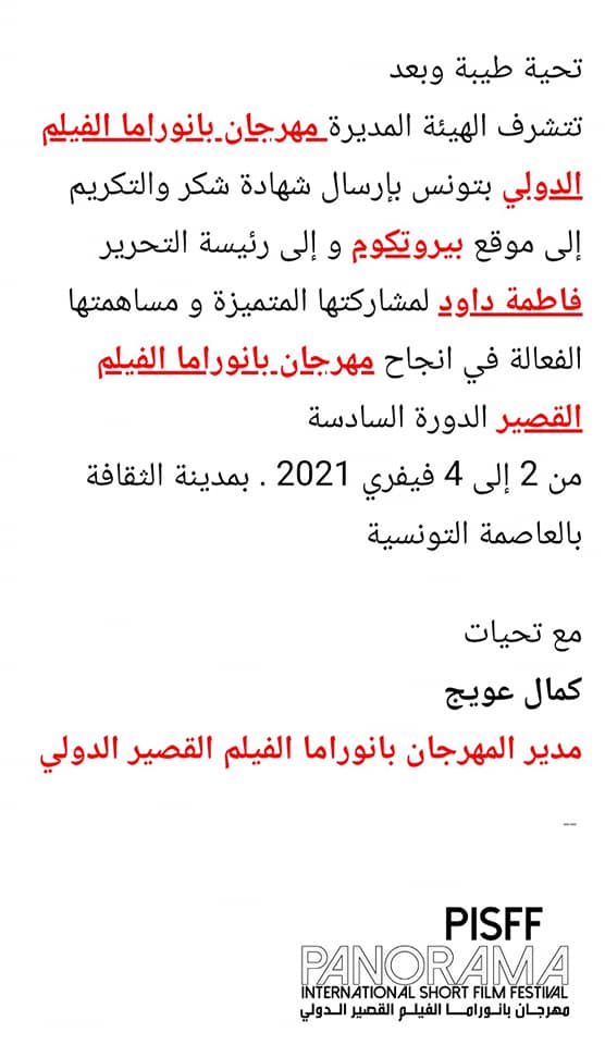 كرم مهرجان بانوراما الفيلم الدولي للافلام القصيرة في تونس موقع بيروتكم ورئيسة التحرير الاعلامية فاطمة داود على الجهود الكبيرة والمشاركة المميزة والمساهمة الفعالة في انجاح المهرجان بدورته السادسة التي اقيمت بين 2 و 4 فبراير 2021، بمدينة الثقافة بالعاصمة التونسية.
