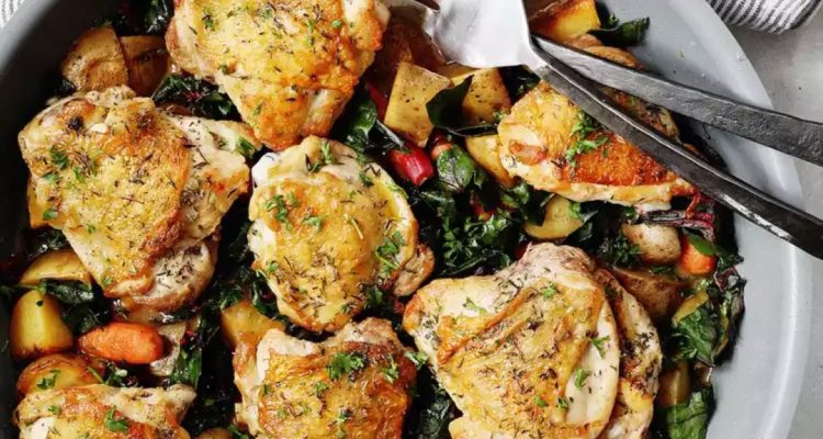أضف سيقان السلق والثوم المهروس وسائل التحمير إلى المقلاة مع الخضار. ضعي قطع الدجاج في الأعلى ورشيها بالزعتر.