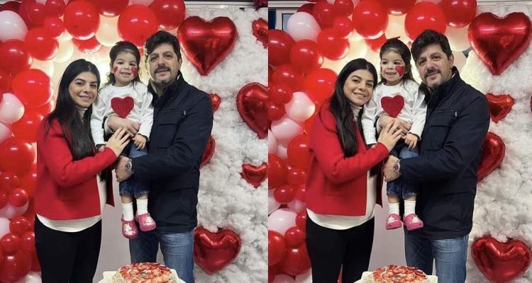 وفي الصورة، يظهر طوني مع زوجته أمونة عيد وابنتهما تاليا في الوسط، في أجواء احتفالية مع القلوب الحمراء بمناسبة عيد الحب.