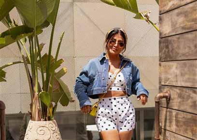 وارتدت أيضا جاكيت قصير من الجينز، ورفعت شعرها للأعلى ونسقت مع إطلالتها حقيبة صغيرة باللون الأصفر.
