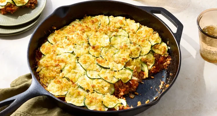 انقل الصلصة إلى المقلاة؛ أضف الأرز، ثم الكوسا والبصل. انقل الصلصة إلى مقلاة كبيرة من حديد الزهر أو مقلاة مقاومة للحرارة. صفّ الأرز، ثم قلّبه في الصلصة. ضع البصل فوقها، ثم رتّب الكوسا بعناية في طبقة واحدة متداخلة قليلاً؛ تبّل بالملح والفلفل.