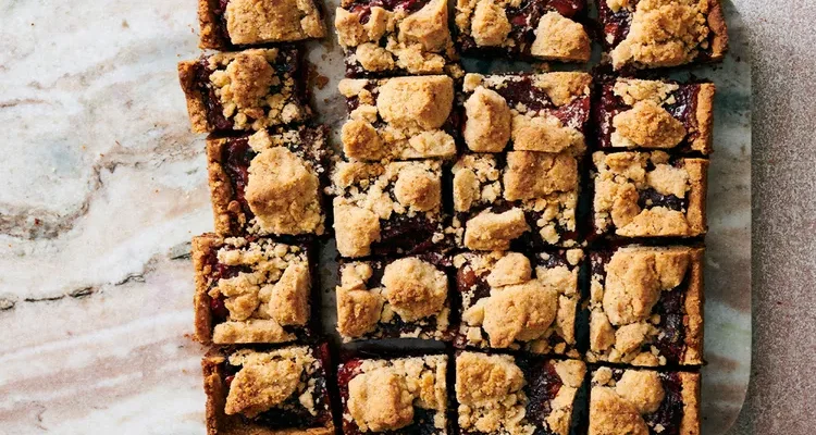 اخبز حتى يصبح لون الطبقة العلوية المتفتتة ذهبيًا، لمدة 35 إلى 40 دقيقة. اتركها تبرد تمامًا في صينية موضوعة على رف سلكي. مرر سكينًا بين القشرة والصينية على طول الجانبين بدون ورق برشمان. استخدم بقايا ورق البرشمان لنقلها إلى لوح التقطيع وقطعها إلى قطع للتقديم.