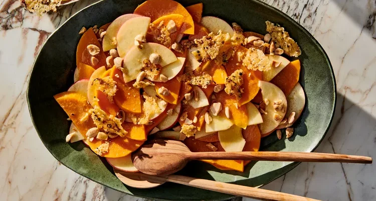 زيّن القرع والتفاح بنصف كمية الفريكو بالليمون والفلفل واللوز؛ قدّمه مع باقي الصلصة والفريكو على الجانب.