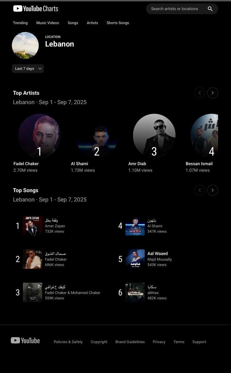 تصدر الفنان عامر زيان بأغنية الجديدة التي تحمل عنوان وقفة بطل الـ Youtube chart في لبنان بالأسبوع الأول من شهر أيلول/ سبتمبر، كما وحققت 3.5 مليون مشاهدة على اليوتيوب.