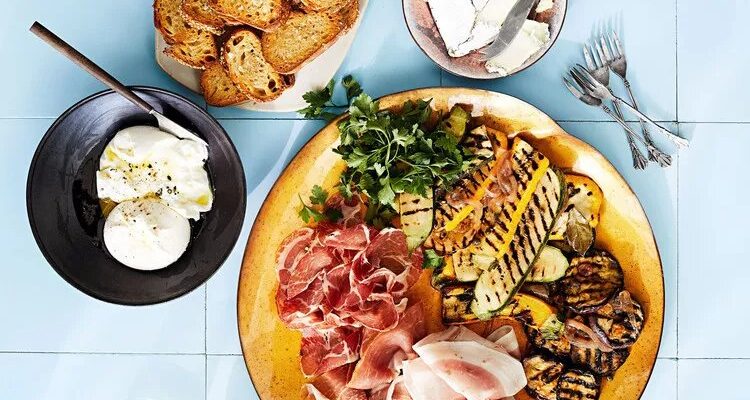 تشكيلة من المقبلات هي الخيار الأمثل لأجواء الصيف الممتعة! يُنقع الباذنجان والقرع المشوي في صلصة حلوة وحامضة غنية بالزبيب الممتلئ والكبر المالح، ثم يُقدم مع اللحوم المقددة، وجبنة البوراتا، وجبن الماعز، وخبز السمسم المحمص.