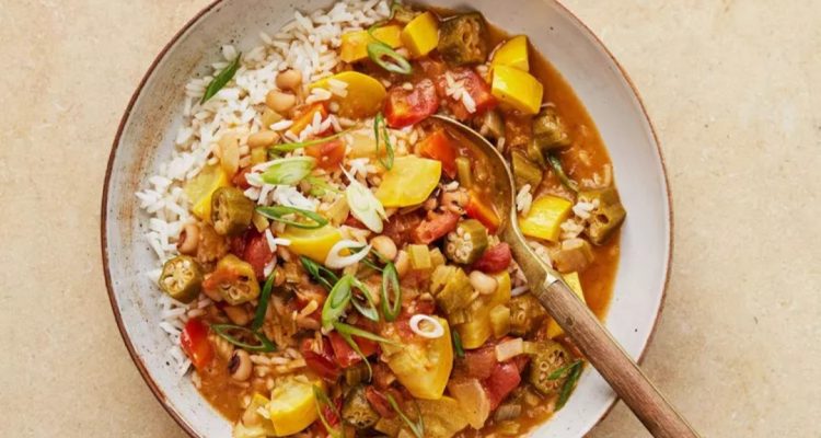 أضف المرق والبامية والقرع والبازلاء. اترك المزيج يغلي، ثم خفّض الحرارة إلى متوسطة-منخفضة، واتركه على نار هادئة مع التحريك من حين لآخر، حتى تنضج الخضراوات، حوالي 30 دقيقة. قدّمه مع الأرز، مرشوشًا بالبصل الأخضر.