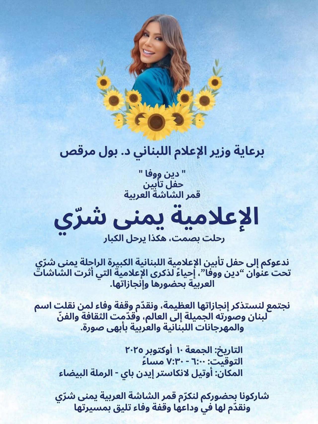 تحت عنوان “دين ووفا”، يقام حفل تأبيني للإعلامية اللبنانية الكبيرة الراحلة يمنى شري، تكريمًا لمسيرتها الإعلامية الغنية التي أثرت الشاشات العربية بحضورها وإنجازاتها، وذلك يوم الجمعة 11 تشرين الأول 2025 في فندق لانكاستر إيدن باي – الرملة البيضاء.