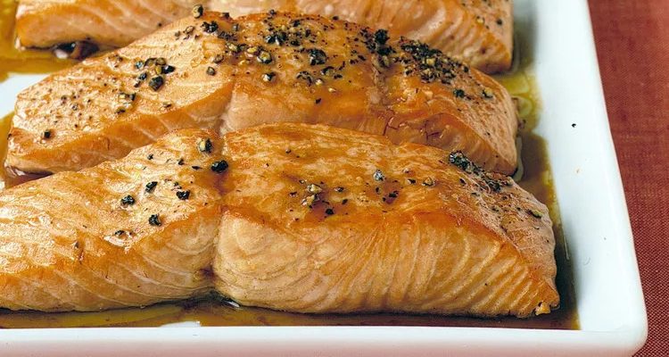 اخبز السمك حتى يصبح لونه داكنًا مع الحفاظ على لونه الوردي الفاتح من الداخل، مع دهنه كل بضع دقائق بطبقة التزيين من صينية الخبز، لمدة ١٥ إلى ٢٠ دقيقة. قدّمه مع شرائح الليمون.