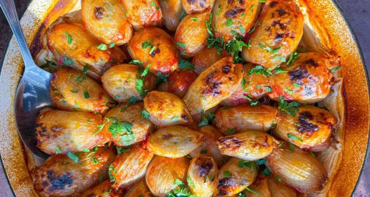 اقطعي أسفل كلّ حبّة بصل حتى تتمكني من تثبيتها في الصينية.